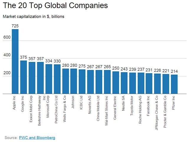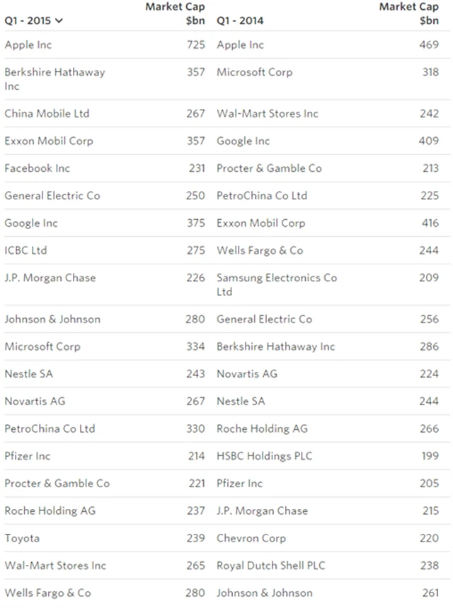 TOP 20 společností má v roce 2015 hodnotu 5,97 bilionu USD, číslo vzrostlo meziročně o 614 miliard USD. Téměř polovinu celého růstu zajistil vzestup ceny akcií Applu.