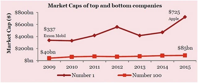 PwC také porovnávala firmy z žebříčku TOP 100 v letech 2015 a 2009. Vstupenkou do TOP 100 je nyní tržní kapitalizace převyšující 85 miliard USD oproti 40 miliardám USD v roce 2009. V aktuálním žebříčku bychom našli jen 66 firem z tehdejší stovky největších.
