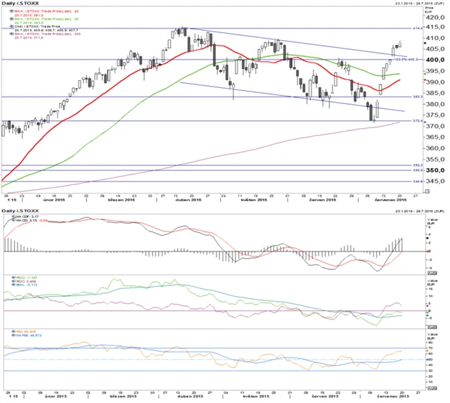 Technická analýza indexů S&P 500, DAX a STOXX Europe 600.