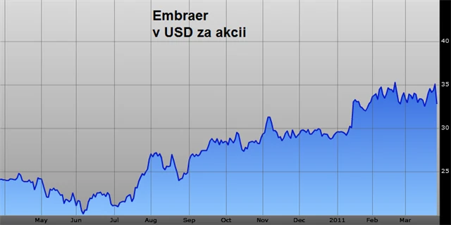 Vývojář a dodavatel civilních i vojenských letounů. Americké ADR brazilské firmy získalo za posledních 12 měsíců 41 % hodnoty, z toho 12 % od počátku roku. 2. května zveřejní výsledky za 4Q10. Ve 3Q čistý zisk povyrostl o 2,7 % na 70c/akcie na více než dvojnásobek konsensu. Tržby ztratily, se -17 % nestačily o 9,5 % na konsensus.