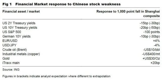 I proto ING vypracovala analýzu toho, kam by se měly pohnout ceny jednotlivých aktiv, pokud by index Shanghai Composite odepsal dalších 1 000 bodů (to by znamenalo návrat na úrovně z prvního pololetí 2014). V tabulce jsou vedle toho v závorkách uvedeny i predikce analytiků z ING, které zohledňují silnější dopady šoku způsobeného pokračujícími propady trhu.