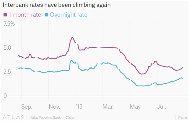 Příliv mezibankovního kapitálu, tedy dodání dalších peněz do finančního systému, ale nakonec znamenal pro centrální banku nové tlaky na jüan.