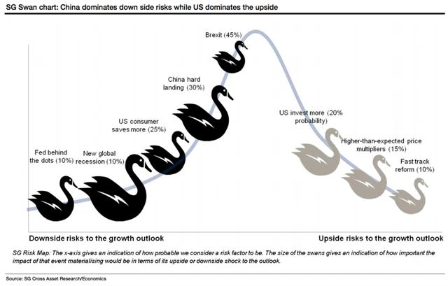 Čínská vláda a centrální banka se v posledních dnech horečně snaží zažehnat paniku, kterou na trhu vyvolává zpomalení růstu druhé největší ekonomiky světa. Société Générale to ale čínským autoritám zatím "nebaští" a ve svém aktualizovaném grafu potenciálních černých labutí (jakkoli jejich predikování popírá definici neočekávanosti černé labutě) označuje Čínu za velkou tržní hrozbu.