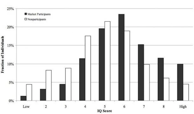 Čím vyšší IQ, tím větší snaha držet více akcií (diverzifikace), podstupovat menší riziko a platit co nejnižší poplatky. Inteligentní investoři také upřednostňují akcie, protože vědí, že nabízejí atraktivnější výnosy než dluhopisy nebo fondy peněžního trhu. Vyplývá to ze studie časopisu Journal of Finance. Graf ukazuje, že s rostoucím IQ roste výrazně také počet investorů do akcií.