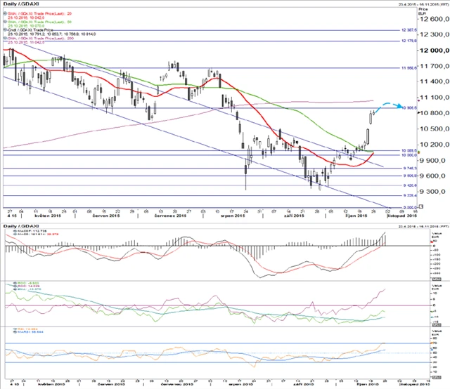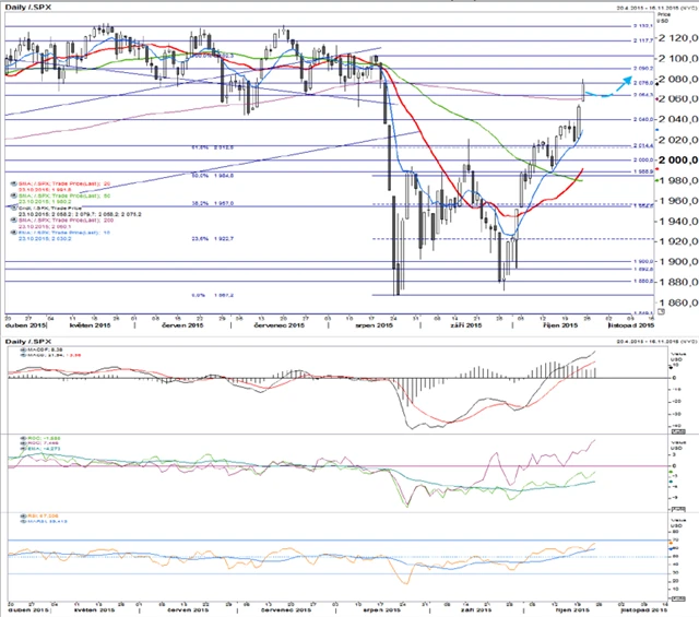 Index se poprvé od srpna dostal nad 200denní klouzavý průměr (fialová křivka). MACD je pozitivní a roste. Obě ROC rostou, ROC60 je ale stále v mínusu. RSI (nyní 67 bodů) se postupně blíží hranici překoupenosti.