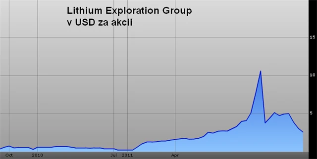 Tím se dostáváme ke společnosti, která se teprve před nedávnem dostala na akciový trh a nutno říci, že lze od té doby najít podobně volatilní akcii. Jedná se o americkou těžební společnost Lithium Exploration Group (LEXG, resp. LEXG.OB), jejímž zaměřením je právě těžba lihtia.