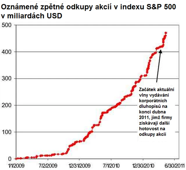 Vzpruha pro akciové býky - V posledních týdnech strmě roste objem zpětných odkupů akcií v indexu S&P 500. Firmy podle všeho získávají hotovost vydáváním svých dluhopisů. Chtějí tak využít situace, kdy jsou na trhu extrémně nízké úroky. A tak nakupují své vlastní akcie a snižují počet těch volných na trhu. Samotné firmy jsou tak jedním z motorů posilování akciových indexů, které se stále drží poblíž svých 3letých maxim.