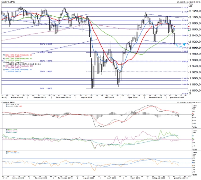 Technické indikátory jsou celkově negativní, na druhou stranu před indexem leží dvě důležité úrovně podpory. V následujících dnech očekáváme, že index otestuje psychologickou úroveň 2 000 bodů. Spíše sázíme na to, že se (prozatím) udrží nad ní.