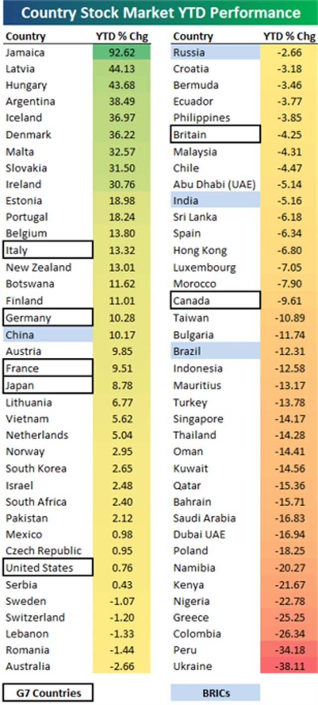 Ze zemí BRICS si nejlépe vedly akciové trhy v Číně (+10,2 %) a Jihoafrické republice (+2,4 %), které také jako jediné z této skupiny skončily v zelených číslech. Nejhůře naopak dopadly burzy v Indii (-5,2 %) a Brazílii (-12,3 %).