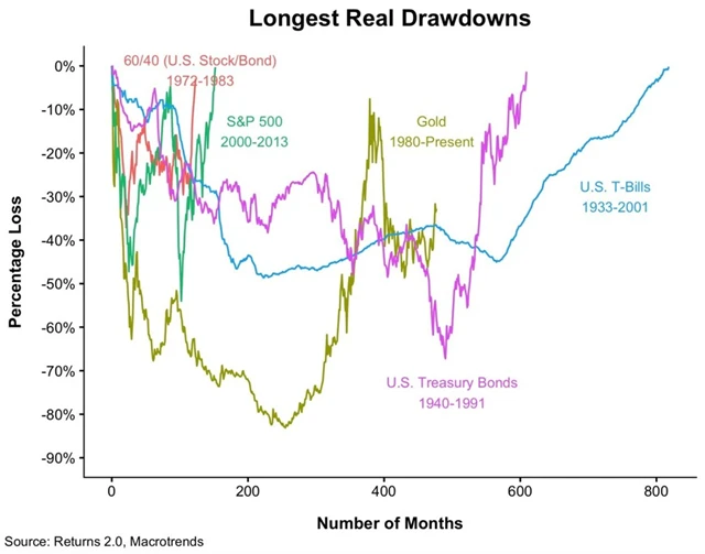 Jak ukazuje graf, záleží na úhlu pohledu. Je totiž sice pravda, že propady akcií bývají dramatičtější než propady na dluhopisovém trhu, na druhou stranu ale také platí, že akcie mají tendenci ztráty smazat rychleji než právě dluhopisy, a to jak ty s dlouhou dobou splatnosti, tak například měsíční pokladniční poukázky.