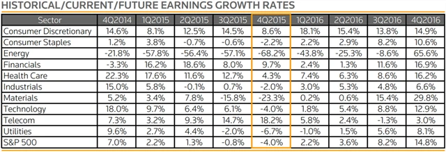 Analytici oslovení agenturou Thomson Reuters od dubna 2015 očekávali více než 5% tempo růstu zisků amerických firem ve čtvrtém čtvrtletí 2015, postupně je ale revidovali níže na jednociferné míry, až se svými odhady začátkem léta klesli do mínusu. Na začátku ledna počítali již s poklesem zisků za 4Q2015 o 4 %, přestože se i v minulé výsledkové sezóně potvrdilo, že původně velmi pesimistické odhady nebyly úplně namístě (analytici na počátku výsledkové sezóny za 3Q2015 předpovídali pokles zisků amerických firem o více než 4 %, nakonec se ale zisky snížily jen o 0,8 %, což bylo vzhledem k velmi negativnímu příspěvku sektoru energetiky překvapením).