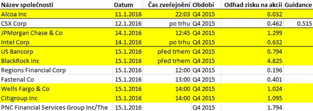 "Očekává se, že zisk na akcii firem z indexu S&P 500 ve čtvrtém kvartálu 2015 klesl již třetí čtvrtletí za sebou. To se naposledy stalo během krize v letech 2008 až 2009. Příčinou je meziročně silnější dolar a důsledky propadu cen ropy na výrobu a zvláště na energetický sektor. U toho se očekává meziroční pokles zisků o dvě třetiny, pravděpodobně umocněný o odpisy aktiv," vysvětluje Martin Krajhanzl, analytik z České spořitelny. "Investoři se budou zajímat také o komentáře firem k Číně. Dalším tématem je zatím neobvykle teplá zima na severní polokouli, která se už podle komentářů některých maloobchodních prodejců projevila v nižších prodejích zimního oblečení."