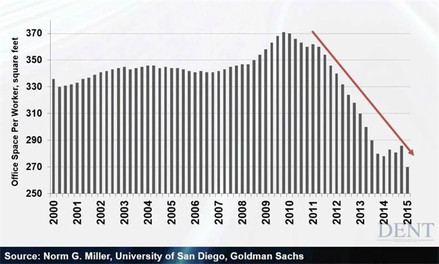 Za posledních šest let ale číslo kleslo o více než čtvrtinu. Na první pohled je zřejmé, že je to díky tomu, že firmy přijímají nové zaměstnance, čímž klesá prostor na jednoho člověka. Především jde ovšem o to, že firmy většinou jen zaměstnávají lidi, které předtím propustily, a co je důležitější, neinvestují do nových komerčních nemovitostí. Před rokem 2007 jsme byli svědky velkého boomu, kvůli čemuž je nyní na trhu převis nabídky.