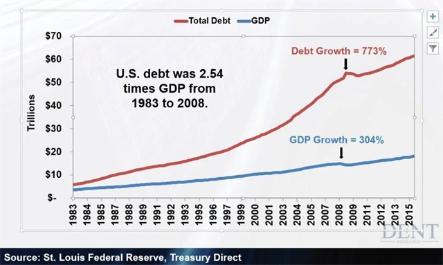 Jak je patrné z druhého grafu, dluh v USA se v 26 letech do roku 2008 dostal na 2,54násobek HDP, což neznamená pokračující expanzi, ale spíše snižování zadlužení a stagnaci (v horším případě depresi). Firmy ve snaze navyšovat výnosy přistupují k účetnímu inženýrství, a to vše s posvěcením Fedu, který drží úrokové sazby na velice nízké úrovni. Mají tak dvě možnosti - přistoupit ke zpětným odkupům a zvyšovat P/E při stagnujících příjmech, nebo navyšovat dividendy ve snaze porážet klesající výnosy u dluhopisů. Obě tyto možnosti naplno využívají.