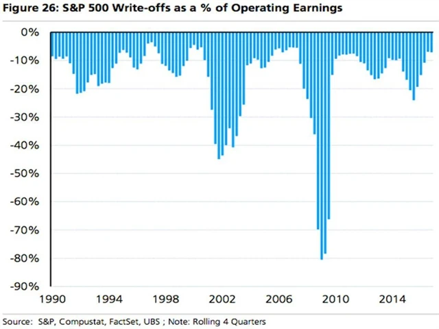 Stratég Julian Emanuel z UBS ale opakovaně upozorňuje na to, že se kvalita výsledkových zpráv od amerických firem v tomto směru od poslední finanční krize výrazně zlepšila. Dokazuje to grafem, který ukazuje pokles objemu firemních odpisů. Jejich poslední vrchol souvisel právě s krizí, především odpisy ve finančním sektoru.