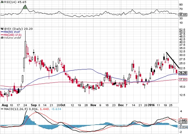 Po maximech z 20. ledna klesá index volatility k 20. Poblíž této hodnoty pravděpodobně bude dlouhodobé rozpětí, znamená to návrat k dlouhodobému průměru.