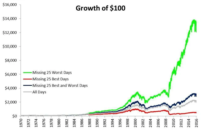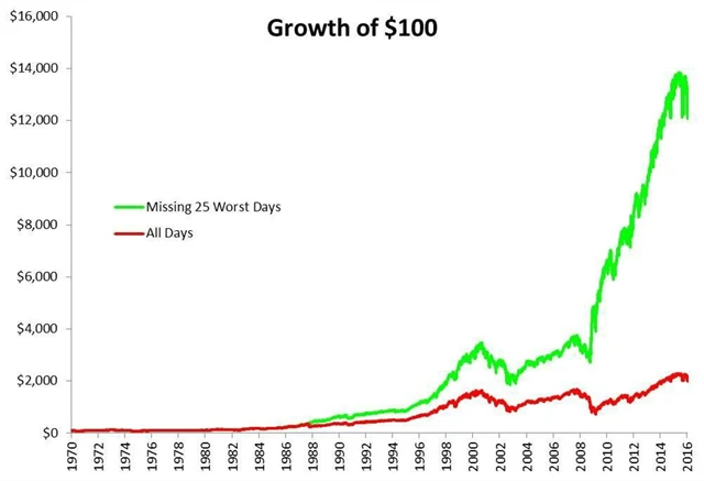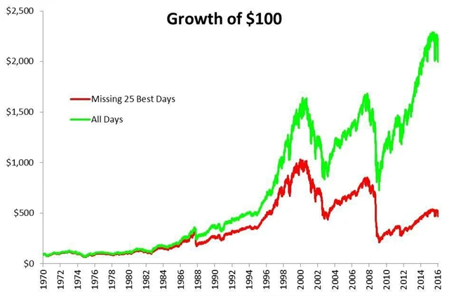 Hned na prvním grafu je vidět, že časování trhů znamená mnohem nižší zisky než klasická strategie "kup a drž". Stačilo díky spekulacím minout 25 nejvýdělečnějších dnů (z celkového počtu 11 620) v období od roku 1970 do současnosti. Kdyby se to nějakému nešťastníkovi skutečně stalo, jeho celkový výnos by klesl z 1 910 % (6,7 % ročně) na 371 % (3,4 % ročně). I měsíční státní pokladniční poukázky USA vydělaly v tomto období více (4,9 % ročně).