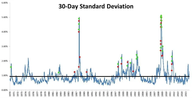 Ale na nejlepších a nejhorších dnech je ještě jedna zajímavá věc. Z grafu níže je patrné, že tyto dny mají tendenci se "sdružovat" v obdobích s větší volatilitou (zelené tečky jsou nejvýdělečnější dny, červené nejztrátovější). Všech 50 těchto extrémních dnů se nachází v obdobích s nadprůměrnou volatilitou (černá čára).