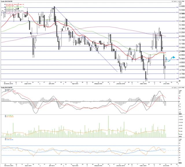 Akcie Komerční banky našly podporu a vrátily se na dohled psychologické úrovně 5 000 Kč. MACD klesá a je pod spouštěcí linií. Objemy obchodů stagnují. RSI se zdola přibližuje hranici 50 bodů.