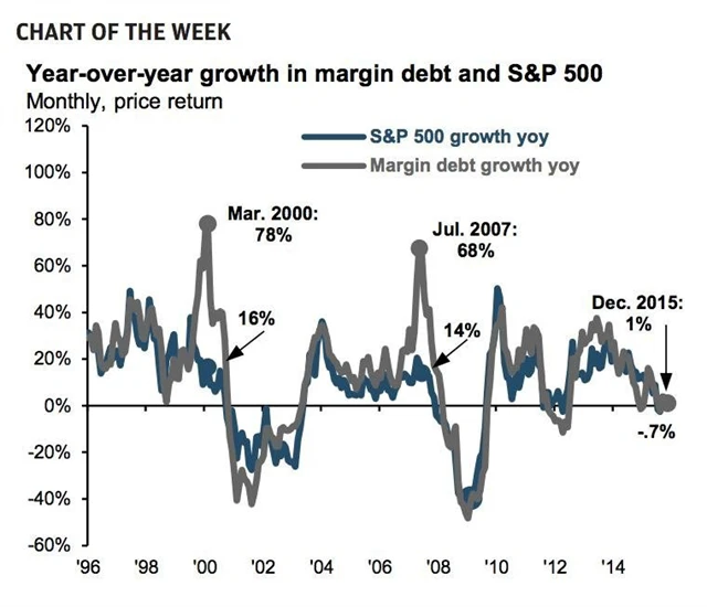 "V letech 2000 a 2007 byl patrný výrazný nesoulad mezi růstem margin debt a akciového trhu, když zmíněné půjčky na nákupy akcií rostly zhruba pětkrát rychleji než ceny akcií. Fundamenty se tehdy logicky rozcházely s výkonem akcií," napsala banka v týdenní zprávě o situaci na trhu. "Loni přitom margin debt narostl jen o 1 % a S&P 500 ztratil 0,7 %. Celkově je margin debt vysoký, ale dynamika jeho růstu vzhledem k výkonnosti trhu naznačuje, že jsou investoři v současnosti výrazně opatrnější. Celkově proto trh není ve stejné fázi jako v letech 2000 a 2007."