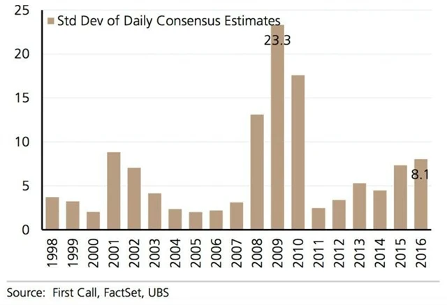 Zpátky k UBS. Bez ohledu na očekávaný směr je dnes volatilita u odhadovaných zisků společností nejvyšší za posledních šest let, což slibuje pokračování kolísavého vývoje na trzích.