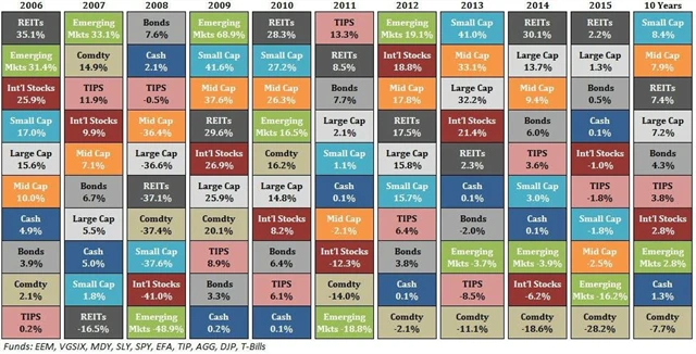 Z grafu je patrné, že stačí několik špatných let, nebo naopak velmi dobrých let, aby se celková dlouhodobá výkonnost poměrně dramaticky změnila. Pokud bychom vynechali poslední dva roky, na čele pořadí podle celkové výkonnosti by byly rozvíjející se trhy (+15 %) následované středně velkými společnostmi (mid caps +13 %), malými firmami (+13 %), nemovitostmi (REITs +11 %), světovými akciemi (international stocks +10 %), velkými firmami (large caps +9 %), inflačně zajištěnými dluhopisy (TIPS +5 %), dluhopisy (bonds +5 %), komoditami (+3 %) a hotovostí (+2 %). Komodity a rozvíjející se trhy zkrátka v posledních dvou letech nebyly zrovna za hvězdy, čímž utrpěla jejich celková sledovaná výkonnost.