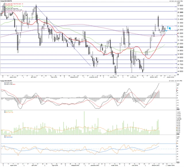 Akcie Komerční banky našly podporu na 200denním klouzavém průměru. MACD je nejvýše za posledních šest měsíců a strmě roste. Objemy obchodů se zvýšily. RSI je překoupený.