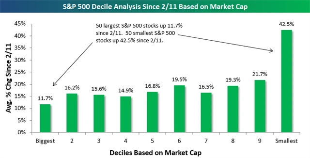Desetina těch nejmenších firem z indexu S&P 500 (nejde tedy stále o žádné trpaslíky) podává od 11. února, kdy americký trh dosedl na lokální dno, jasně nejlepší výkon. Nejhůře jsou na tom naopak ty největší firmy, takzvané mega caps.