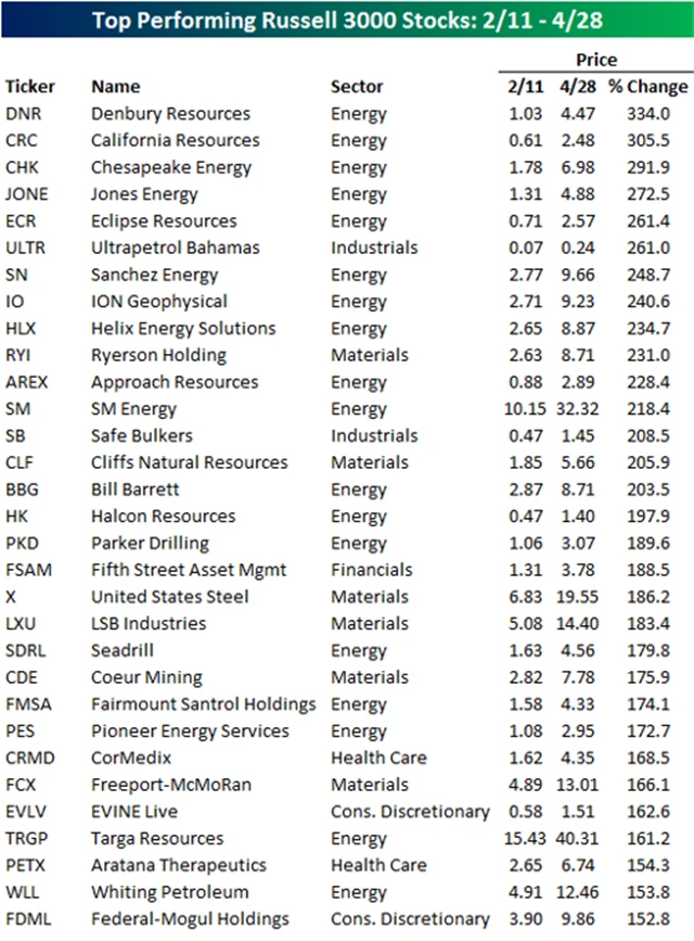 Pro opravdu odvážné spekulanty jsou ale na trhu často jiné firmy než ty z největšího amerického akciového benchmarku. Druhá tabulka shrnuje akcie z indexu Russell 3000, které ode dna trhu 11. února posílily nejvíce. Nezřídka jde o pohyby ve stovkách procent. Nepřekvapí, že jde z valné většiny o akcie s nízkou nominální hodnotou (řádově dolary) a že přes polovinu uvedených firem je ze sektoru, který byl donedávna pod největším tlakem, tedy z odvětví energií.