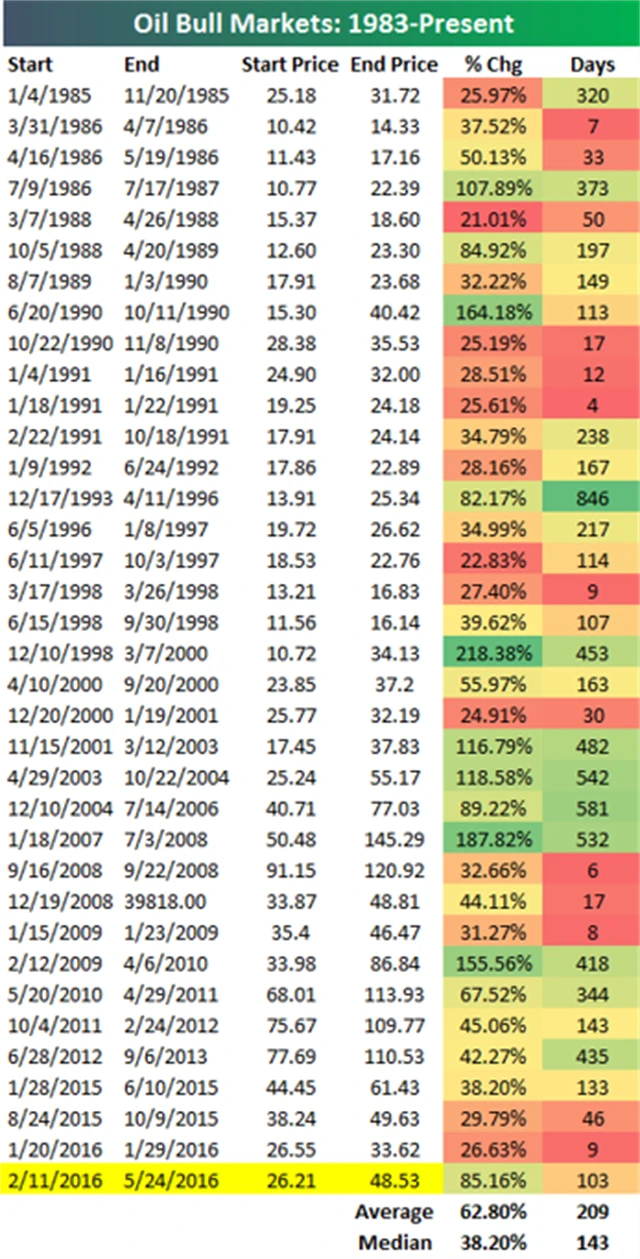 Ode dna, na které stejně jako akciový trh dosedla cena ropy 11. února, do začátku tohoto týdne barel zdražil o více než 80 %. Tato míra růstu je nejvyšší od 155% posílení ropy do dubna 2010. Jak ukazuje statistika pod tabulkou, jde o nadprůměrný býčí trend, pokud jde o procentuální přírůstek, a naopak podprůměrný, pokud jde o délku.