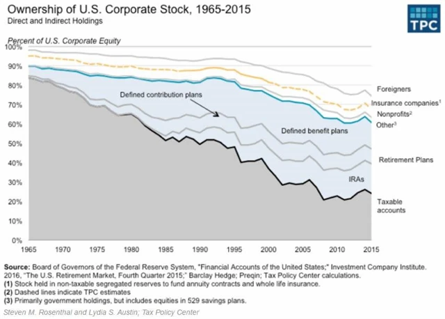 Zajímavý je především vývoj podílu veřejně obchodovaných akcií na obchodních účtech individuálních a institucionálních investorů ve Spojených státech, který se od roku 1965 snížil z více než 80 % na současných 25 %.