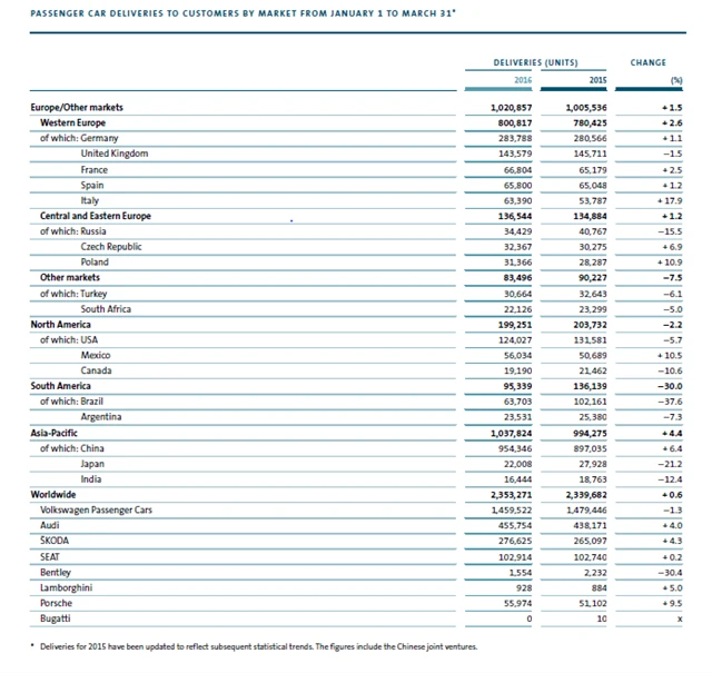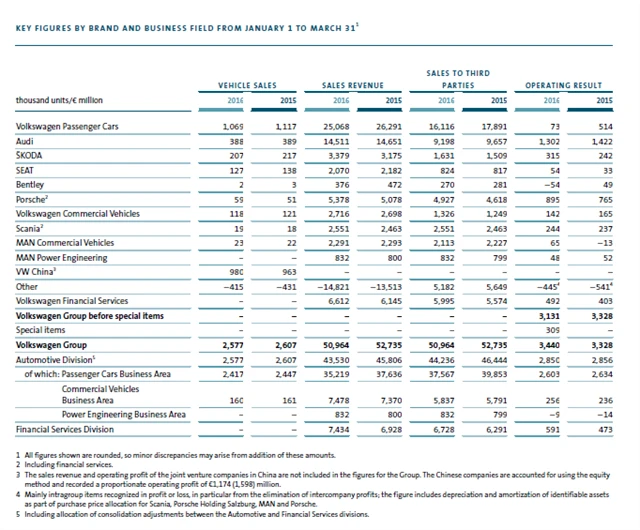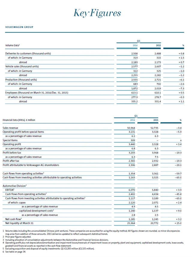 Společnost Volkswagen zveřejnila koncem května hospodářské výsledky za první kvartál letošního roku. Analytici oslovení agenturou Reuters očekávali, že provozní zisk klesne o více než 17 %, oznámená čísla ale výrazně předčila očekávání (koncern reportoval provozní zisk o 3,4 % vyšší, konkrétně 3,44 miliardy eur).