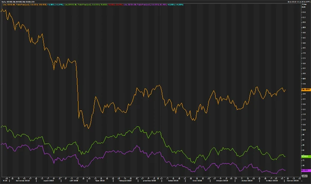 Zajímavé je srovnání s cenami akcií dalších německých automobilek, konkrétně BMW (zeleně) a Daimleru (fialově).