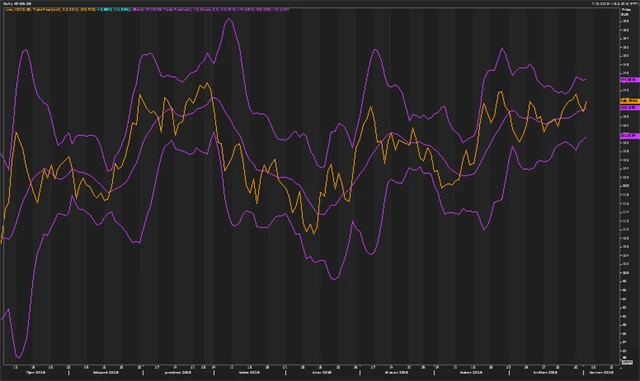 A nakonec akcie Volkswagenu s Bollingerovými pásmy.