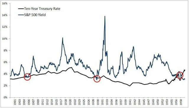Mezi lety 1900 a 1957 byl ve Spojených státech v 99,1 % doby průměrný dividendový výnos akcií z indexu S&P 500 vyšší než výnos 10letých amerických vládních dluhopisů. Poměrně spolehlivě tehdy platilo, že jakmile se tento poměr otočil, považovali investoři akcie za překoupené a z trhu se stahovali. Michael Batnick z poradenské společnosti Ritholtz Wealth Management to vysvětluje tak, že investoři požadovali za riziko spojené s držením akcií jistou kompenzaci. A tou byly právě dividendy.