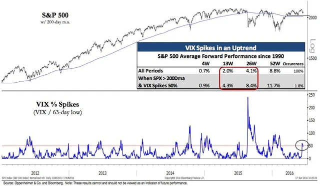 "Růst indexu VIX spustil nákupní signál, protože k růstu volatility došlo během růstového trendu cen akcií. Ten definujeme tak, že je index S&P 500 nad svým 200denním průměrem, zatímco významný růst indexu VIX je pro nás takový, který tento 'index strachu' pošle o více než 50 % nad jeho 63denní průměr," vysvětluje Wald. "Tyto rychlé a výrazné růsty indexu VIX zpravidla nastávají v době, kdy je akciový trh na krátkodobých minimech. Když je trend na akciovém trhu pozitivní, a podle nás nyní je, nákupní signál v podobě výrazného nárůstu volatility je o to přesvědčivější. Od roku 1990 se index S&P 500 v průměru během následujících šesti měsíců po této situaci posunul o 8,4 % výše, zatímco průměr za jakýchkoli šest měsíců je jen 4,1 %."