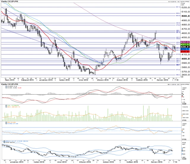 Akcie ČEZ se odrazil od své lokální podpory na úrovni 392 Kč a překročil 20denní klouzavý průměr. Rezistenci titul našel u 50denního průměru a hranice mezery (gapu) vytvořené předchozím propadem, kde se konsolidoval kolem úrovně nad 420 Kč. Důležitá krátkodobá úroveň rezistence je 434 Kč a klouzavé průměry u ní. Technické indikátory ukazují na spíše prorůstové tendence, ale slabší intenzity. MACD prorazila zespodu signální linii a pokračuje růstem, ale při klesajících objemech. RSI nadále testuje hranici 50 bodů. ROC pokračují v růstu.