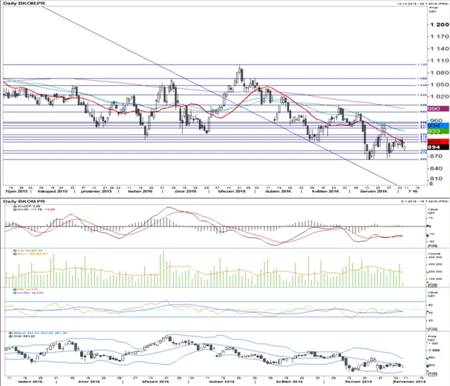Akcie Komerční banky testovaly důležitou hranici rezistence 919 Kč a bez výrazného směru konsolidovaly okolo úrovně 900 Kč. Technické indikátory neukazují na výrazný směr, očekáváme pokračování stagnace. MACD stagnuje při nevýrazných objemech v negativním pásmu. Nadále se drží nad signální linií. RSI pokračuje na úrovni přes 40 bodů. ROC stagnuje v negativním pásmu.