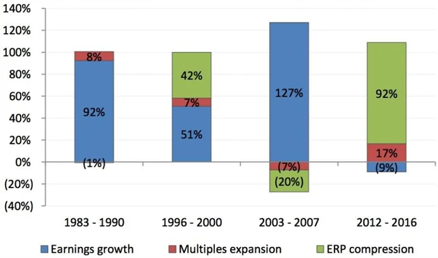 Politika centrálních bank ale může za jednu důležitou věc. Výnosy dluhopisů vyspělých zemí jsou na minimech, mnohdy i v záporu. K tomu, aby investoři místo bondů zařadili raději do portfolia akcie, je tedy nyní může pohnout i daleko nižší očekávaný výnos z držení akcií, než jaký by je přesvědčil v minulosti. Podle Deutsche Bank je to v posledních letech zásadní faktor pro zhodnocení akcií, které tak pokračuje navzdory poklesu ziskovosti a nárůstu valuací.