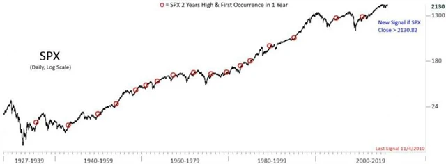 A nakonec jedna býčí historická perlička, kterou připomněl ještě před pondělním rekordem indexu S&P 500 Tom Leveroni z Nautilus Research. Nové alespoň 2leté maximum indexu je podle něj býčím signálem nad všechny ostatní (a ponechme stranou, proč zvolil právě 2 roky jako hranici).
