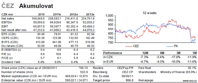 S posunem období predikce snižujeme cílovou cenu pro ČEZ o 7 % na 902 Kč za akcii kvůli vyššímu odhadu čistého dluhu ke konci roku 2011 a mírně nižším střednědobým odhadům, což částečně vyvažuje nižší WACC (efekt bezpečného přístavu).