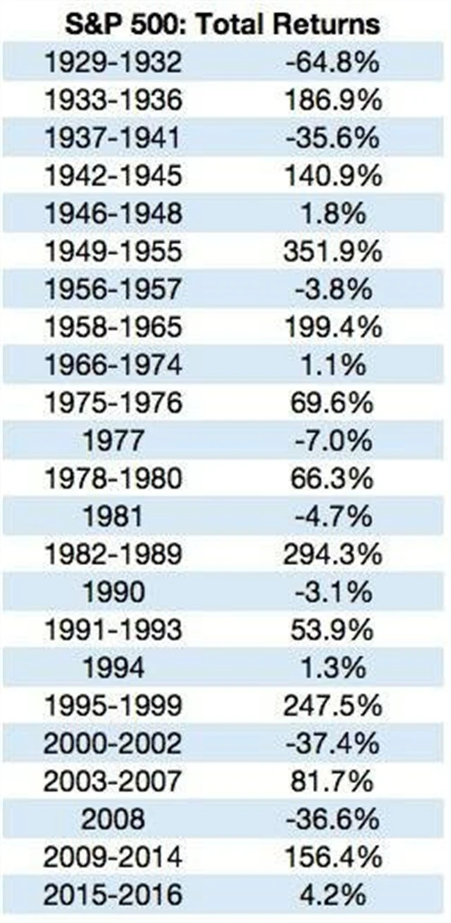 Investoři mohou být z takového vývoje poněkud nervózní, ale měli by mít na paměti, že nejde o nic ojedinělého. Výnosy z držení akcií jsou jako na houpačce vlastně nepřetržitě. Historické výnosy vždy vypadají skvěle na papíře, ale realita je jen málokdy blízká průměrům. Průměrné hodnoty jsou spíše výjimkou, nikoli pravidlem. Uvedená tabulka výnosů indexu S&P 500 v jednotlivých obdobích od roku 1929 to ukazuje celkem jasně.