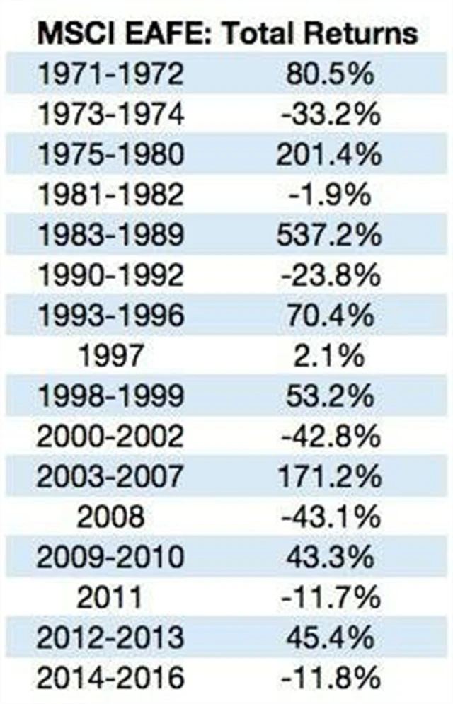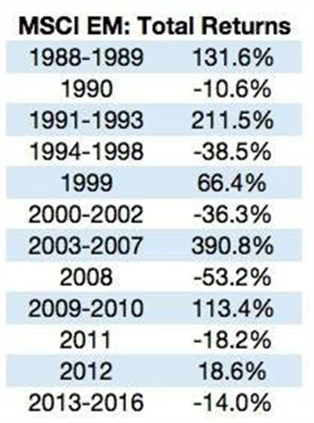 Volatilita je na první pohled zřejmá. Neplatí to pochopitelně jen pro americké akcie, ale globálně (index MSCI EAFE) a pro mladé trhy (index MSCI EM), jak shrnují další dvě tabulky.