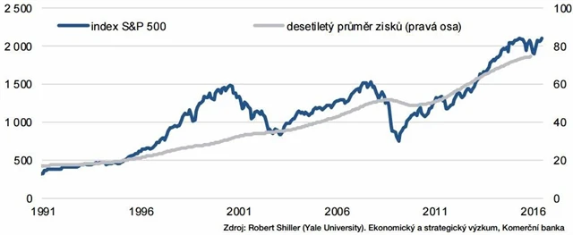 Němý ale dodává, že ve zmiňovaném roce 2000 bylo ocenění na základě zisků firem ještě podstatně vyšší. Současné vysoké ceny akcií navíc částečně ospravedlňuje jejich relativní atraktivita vůči dluhopisům.