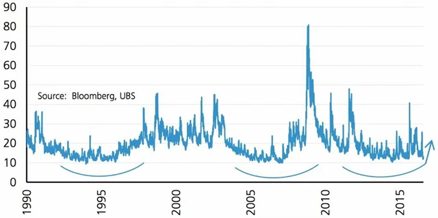 Jako klid před bouří vnímá současné převalování amerických akciových indexů v blízkosti rekordních maxim také Julian Emanuel, stratég z UBS. Hluboký pokles indexu VIX podle něj není udržitelný ve světle významných politických rizik v Evropě i v USA. Věří navíc v dlouhodobý návrat vyšších úrovní kolísavosti trhu.