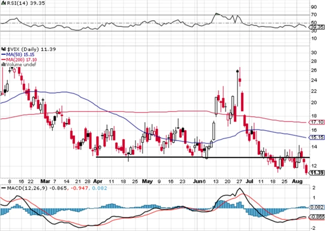 Index volatility VIX nakonec za týden dále klesl a je výrazně pod spodní hranou dlouhodobějšího rozpětí 13-17 bodů. To znamená, že put opce jako případné zajištění či spekulace na pokles jsou nyní velice levné.