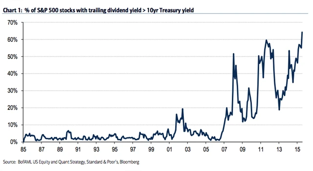 Na konci července plných 65 % firem, jejichž akcie jsou zahrnuty v indexu S&P 500, nabízelo takovou dividendu, že z ní vyplývající dividendový výnos překonával výnos 10letého vládního dluhopisu USA.