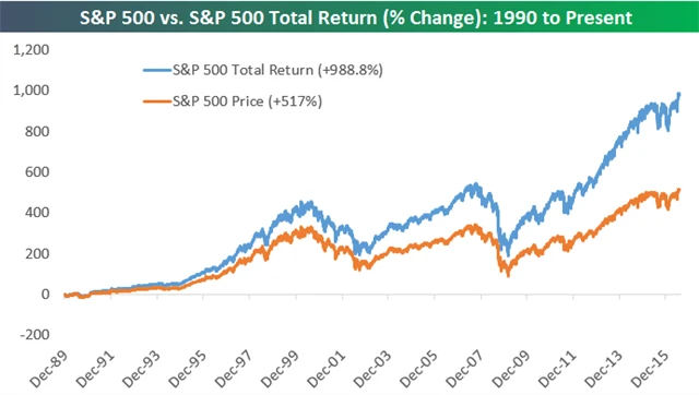 Vliv dividend pro celkové příjmy z držení akcií je dobře popsaný. Nic jej neilustruje lépe než dlouhodobý graf. Ten připomíná, že vedle významu samotných dividend je pro dlouhodobý úspěch při investování velice důležitý právě dlouhodobý investiční horizont a ochota držet pozice po mnoho let.