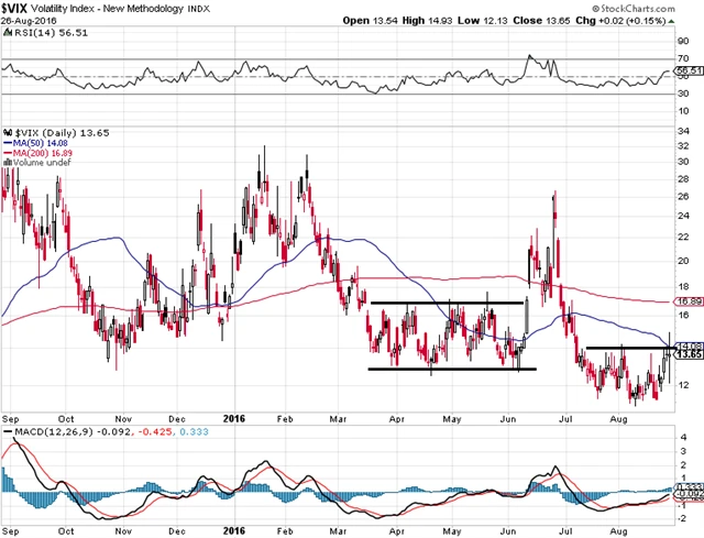 Index volatility VIX sice za týden vzrostl o 20 %, stále se ale drží na velice nízkých hodnotách. V pásmu 13-17 bodů se "index strachu" pohyboval v době jarní renesance býčího trendu, v posledních týdnech se držel dokonce pod 14 body. Pod touto hladinou by růstu cen akcií nemělo nic bránit, střídmý výsledek páteční obchodní seance působí uklidňujícím dojmem. Nezapomínejme ale na sezónnost, klidné olympijské týdny jsou minulostí a začátek podzimu umí být na trzích velice živý.