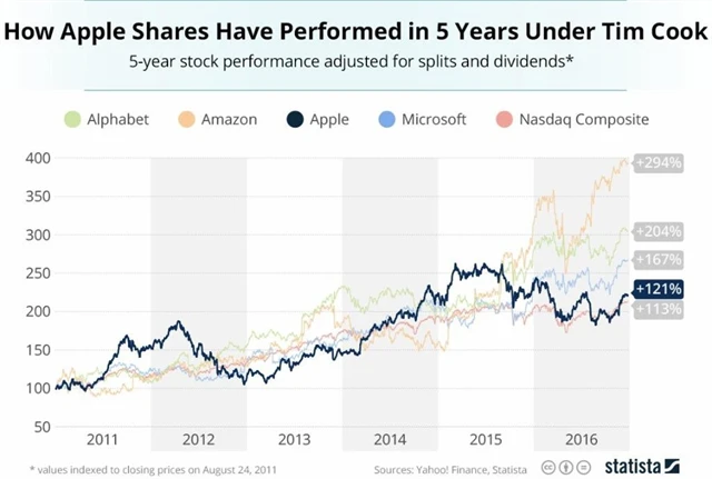 Apple se po naprostou většinu uplynulých let držel na pozici největší veřejně obchodované firmy světa. Hodnota jeho akcií (po očištění o splity a dividendy) se více než zdvojnásobila, což by jiní brali všemi deseti. V nabitém sektoru technologií ovšem Apple začal zaostávat za největšími konkurenty, k nimž se pomalu začíná řadit také Facebook. Akcie Applu navíc jen těsně porážejí index Nasdaq Composite, který na rozdíl od cenných papírů s označením AAPL v uplynulých týdnech posouvá historické rekordy.